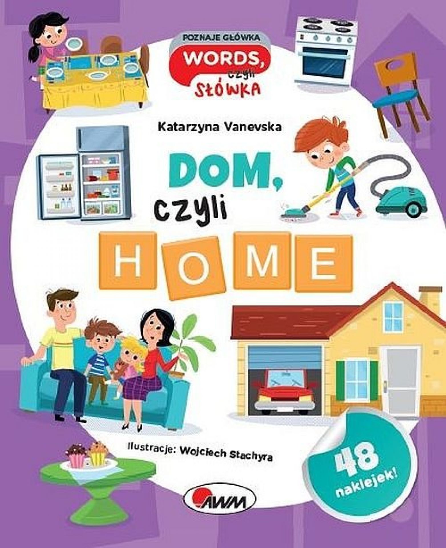Książka zawiera sympatyczne RYMOWANE wyjaśnienia 51 ANGIELSKICH SŁÓWEK związanych z domem: pomieszczeniami, meblami, wyposażeniem i obowiązkami domowymi. Każdej rymowance towarzyszy ZABAWNA ILUSTRACJA sytuacyjna. Umiejętność ZAPAMIĘTYWANIA SŁÓWEK jest wzmacniana dzięki NAKLEJKOM Z ANGIELSKIMI PODPISAMI, które dziecko musi samodzielnie wyszukać i dopasować do rymowanki. Jest to jednocześnie świetna zabawa. Książka zawiera alfabetyczną LISTĘ wszystkich POLSKICH słówek i ich ANGIELSKICH odpowiedników wraz ze słownikowym ZAPISEM WYMOWY.