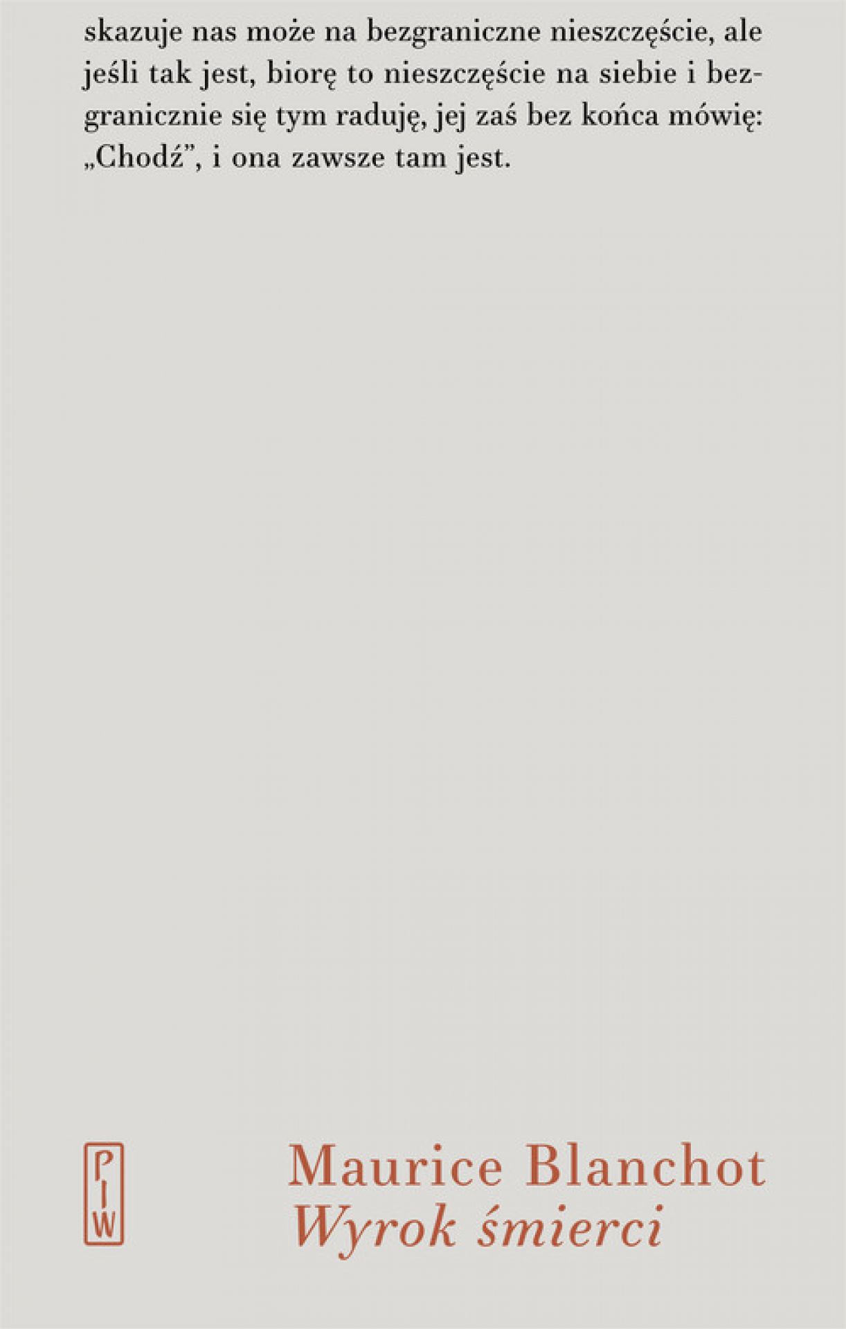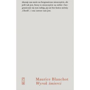 „Pisanie jest po trosze umieraniem” – hołdując tej zasadzie, Maurice Blanchot, jeden z wielkich samotników dwudziestowiecznej literatury, poświęcił się pisaniu. Wyrok śmierci, najsłynniejsza z jego krótkich powieści, ma pozory autobiografii, ale kiedy Blanchot pisze: „Te wypadki przydarzyły się w 1938 roku”, nie ma rzeczy mniej pewnej niż to, kiedy i czy owe wydarzenia się rozegrały. To proza medytacyjna, skupiona na umieraniu bliskiej osoby, być może naznaczona własną chorobą autora, jego osobistym wyrokiem śmierci. Z niebywałą mocą przybliża się do śmierci i ją odsłania, jak nigdy nie uczynił żaden utwór.
